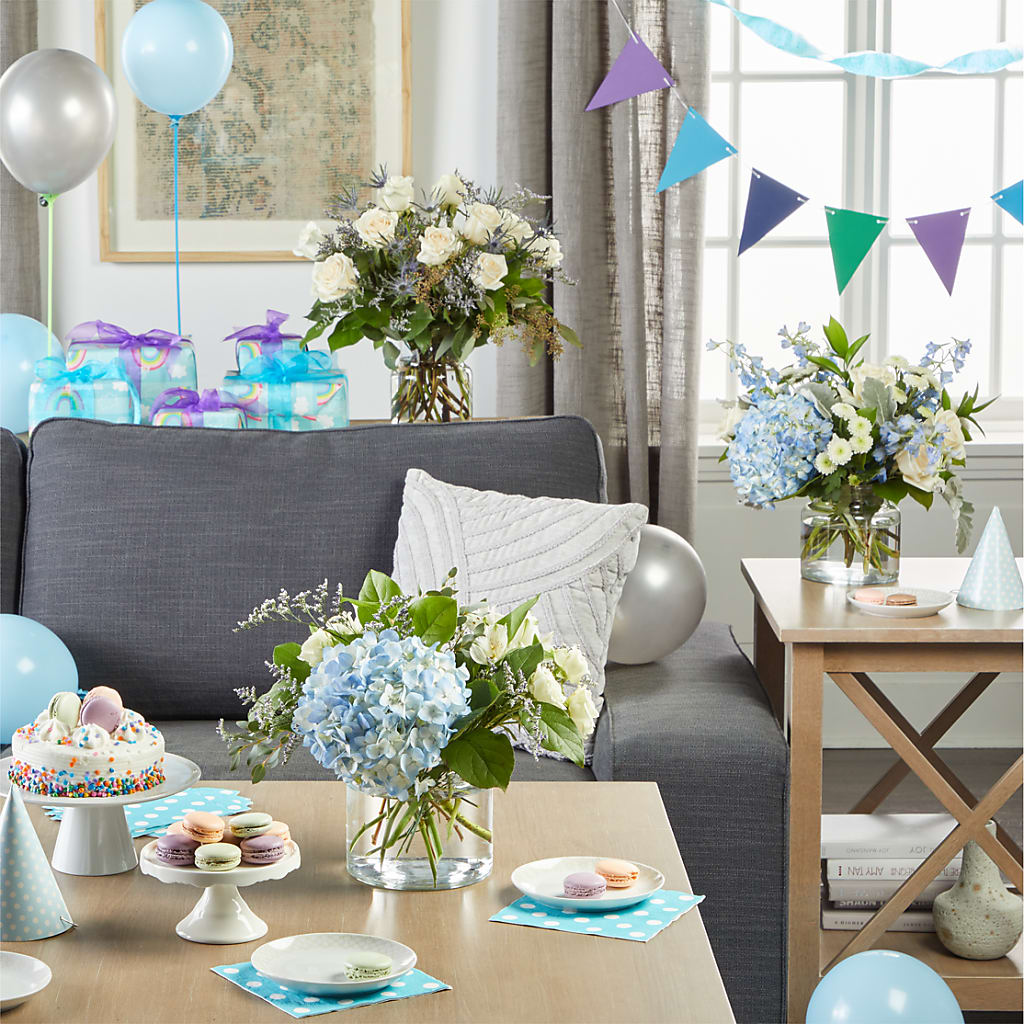 Blue and ivory florals are one of the classiest combinations, adding an air of sophistication to the function. Each arrangement is designed cohesively to decorate the party beautifully.