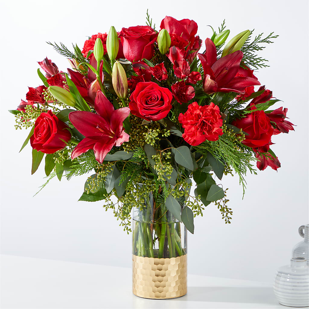 Spread joy this holiday season with a shimmering arrangement of roses, alstroemeria, and the incredible scent of seasonal greens.